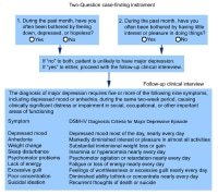 A review of signs and symptoms of anxiety or depression should be sought. A 2-question case-finding instrument can help screen for depression.